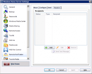 - Open the Windows Home Server console, and navigate to the Remote Notification Settings tab. On the Receive tab, click the “Add” button.